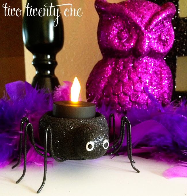 I’ve had the black spiders for a few years now. The battery-operated tea lights are new. They were originally orange, but I fixed that with a little acrylic paint.